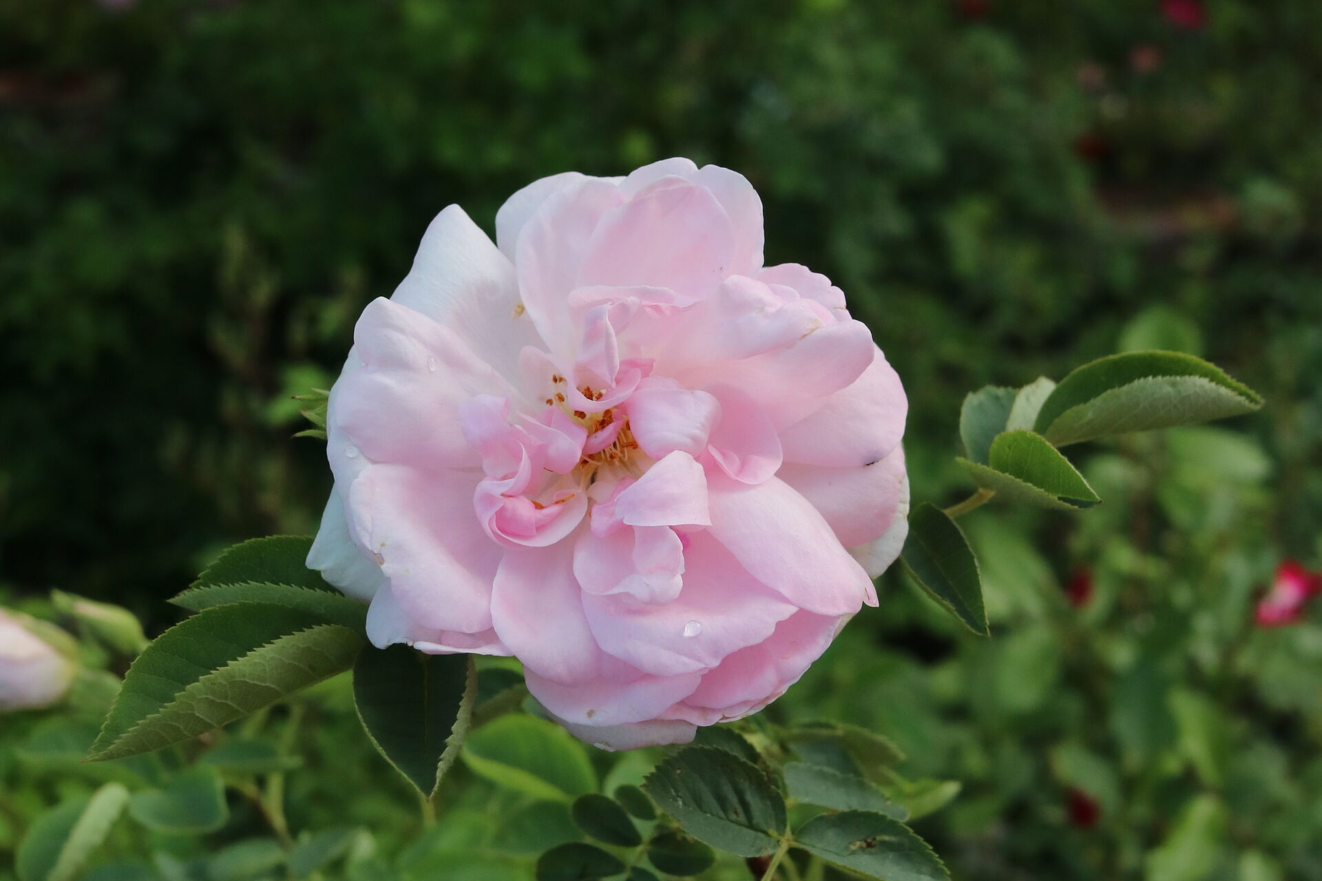 Zartrosa gefüllte Strauchrose.Höhe: 1,5-2m.Blüte: Zartrosa gefüllt. Einmalblühend.