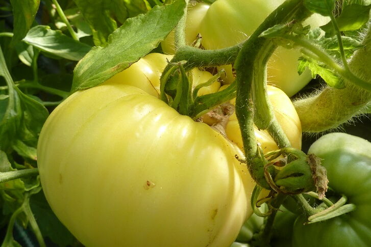 Creme-weiße Fleischtomate. Sehr süßes Aroma. Reif entwickelt die Frucht unten einen zartrosa Hauch.