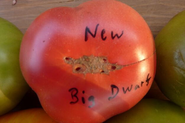 Rote, safrtige Fleischtomate an niedriger Pflanze mit bis 1m Höhe.